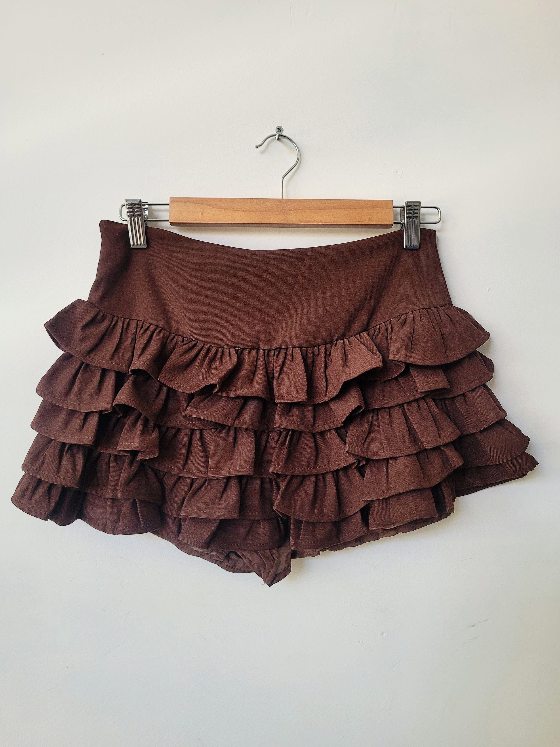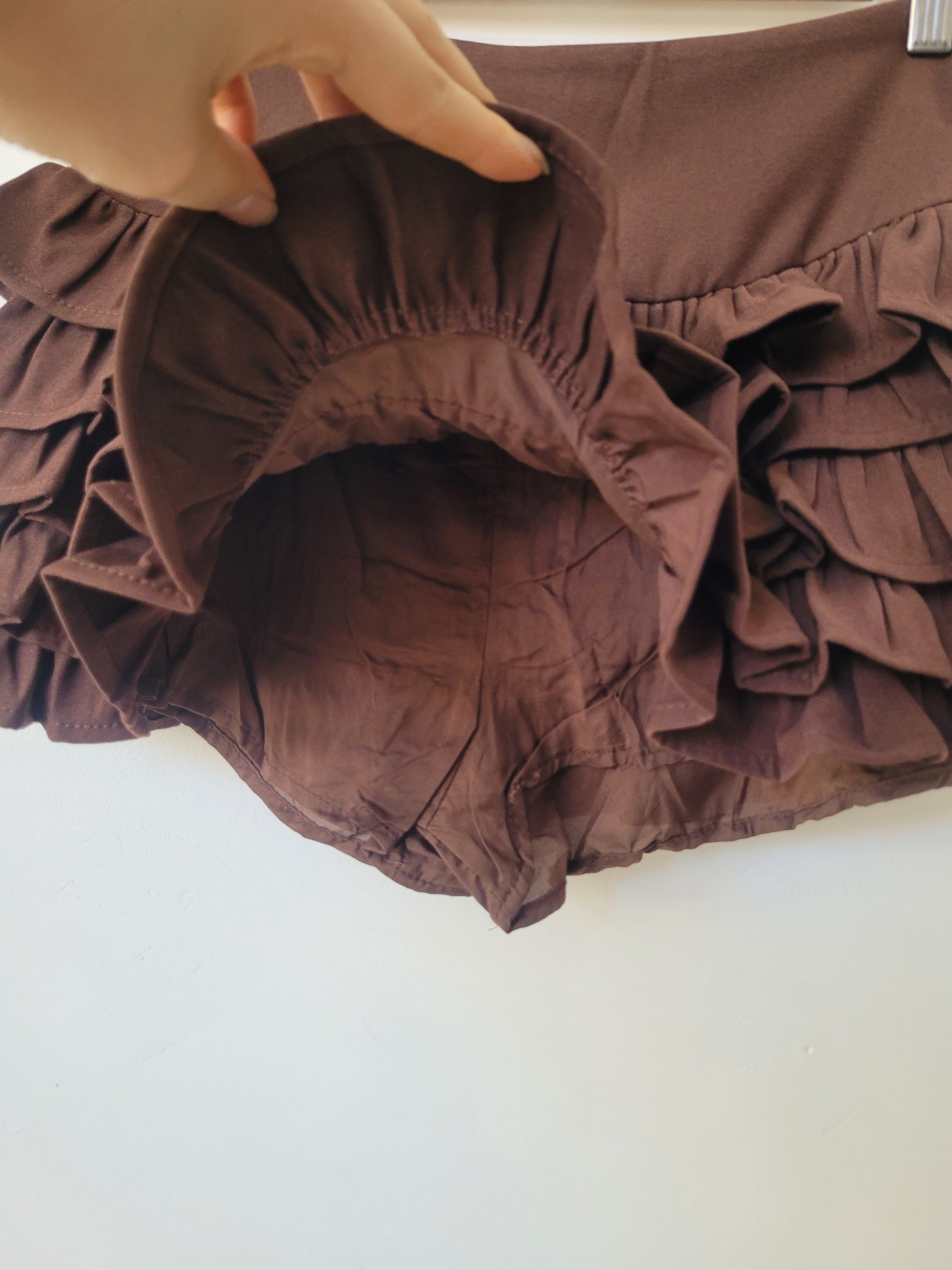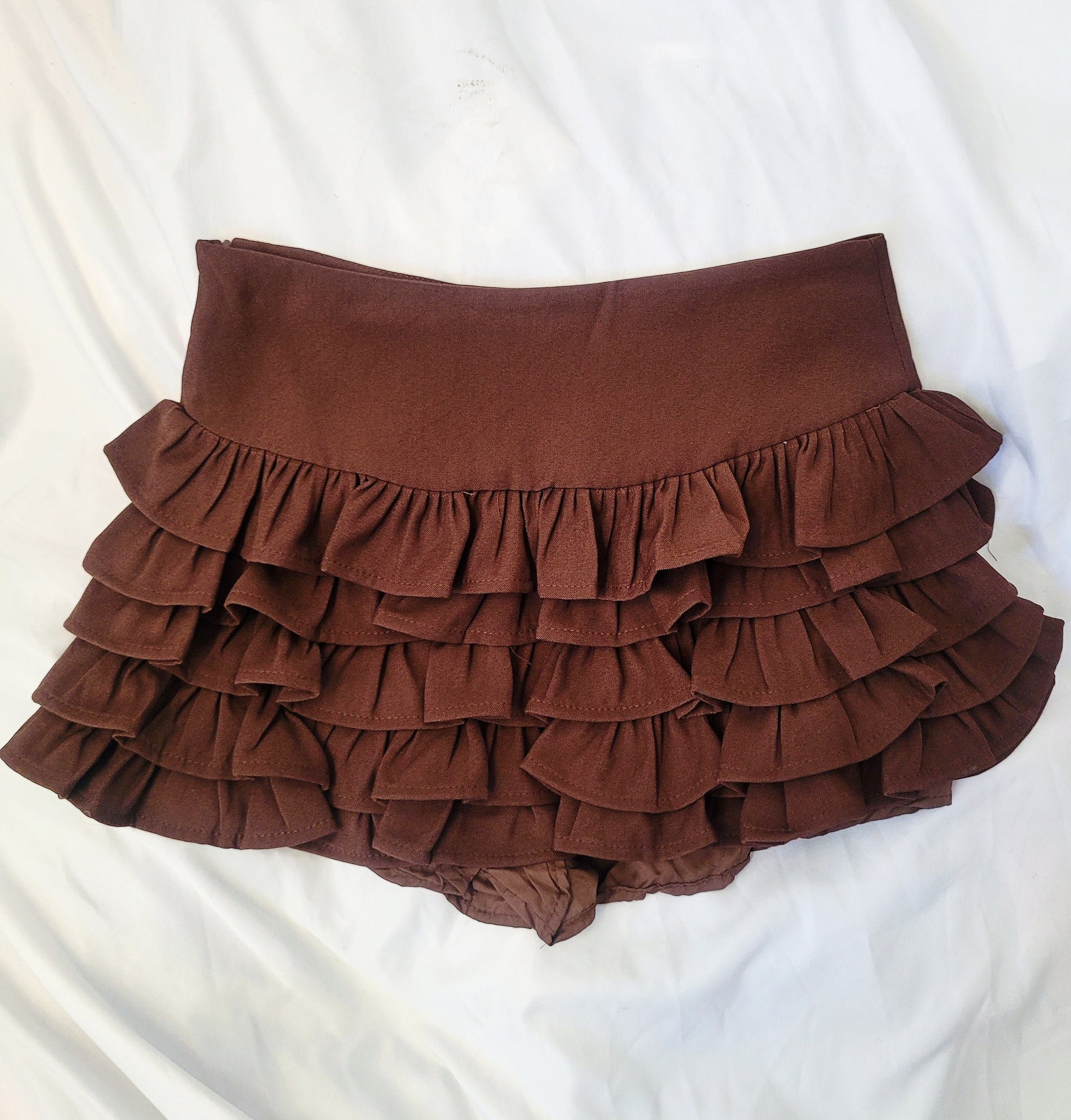 Falda mini short con vuelitos estilo rococo, tela de gabardina y trae cierre al lado izquierdo.